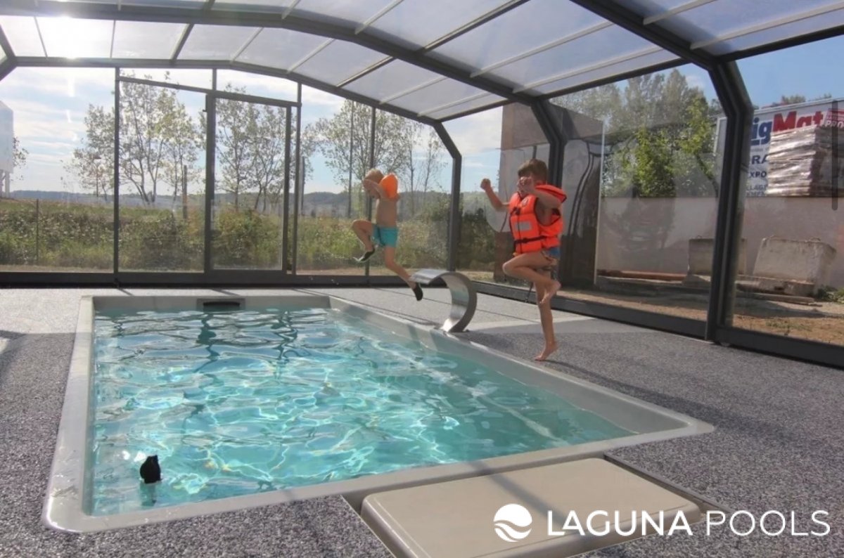 Композитный бассейн внутри павильона с прозрачной крышей и стенами, дети прыгают в воду.